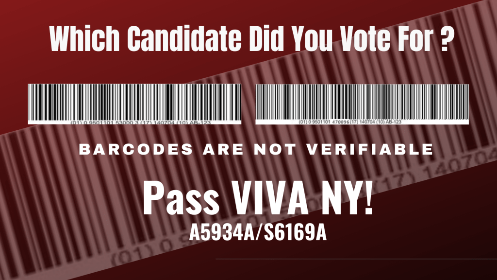 Please help us pass a bill called VIVA NY – The Voting Integrity and Verification Act of New York – A6287 (Brian Cunningham) /S7116 (Cordell Cleare). This is a simple bill that guarantees all New York voters a choice of either a hand-marked paper ballot, or an assistive device, whichever they prefer.