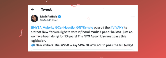 MORE DETAILS: On Friday June 9th, 2023, the last formal day of the NY Legislature, the NY Senate acted responsibly to update the statutes controlling New York voting machines by passing VIVA NY, The Voting Integrity & Verification Act of New York. These statutes have not been significantly updated in 15 years, and revisions are long past due. We are very grateful to the Senate for their serious commitment to improving New York elections.