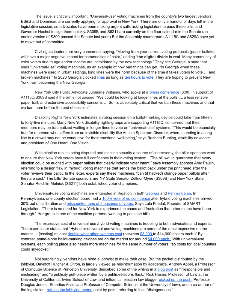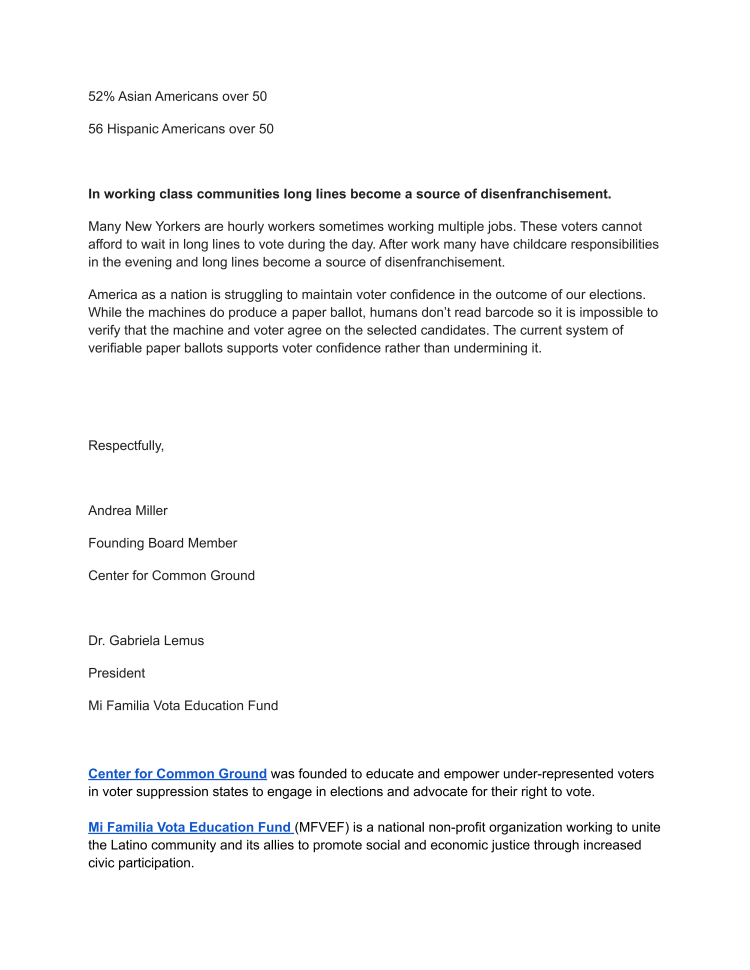 confidence, and vastly increase election budgets. They warn of longer lines to vote, because when “everyone votes on the ballot-marking device … everyone waits longer.” They recommend lawmakers take action to protect New York voters by immediately passing two bills updating New York’s election security laws, which have not had