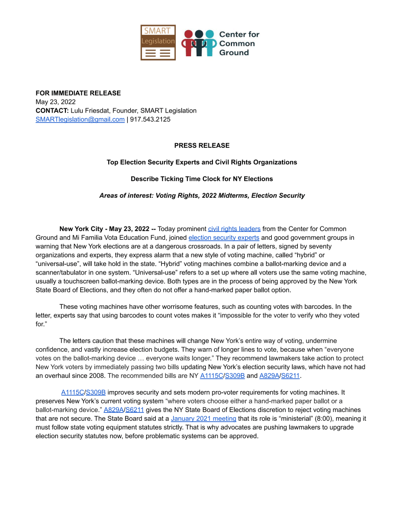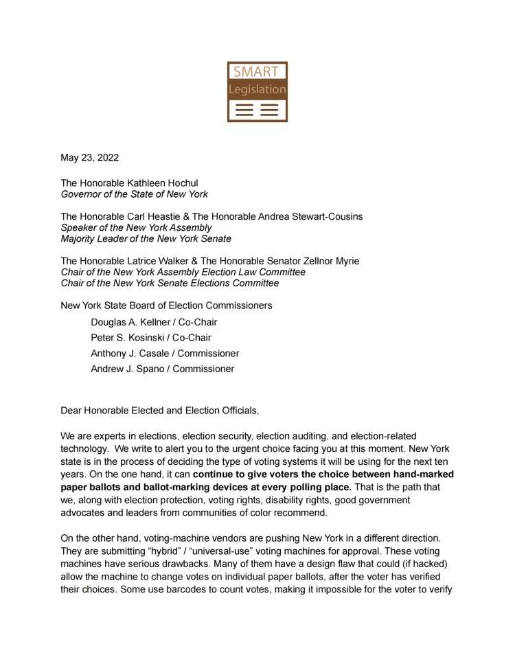New York City – May 23, 2022 — Today prominent civil rights leaders joined election security experts and good government groups in warning that New York elections are at a dangerous crossroads. In a pair of letters, they express alarm that a new style of voting machine, called “hybrid” or “universal-use”, will take hold in the state. “Hybrid” voting machines combine a ballot-marking device and a scanner/tabulator in one system. “Universal-use”