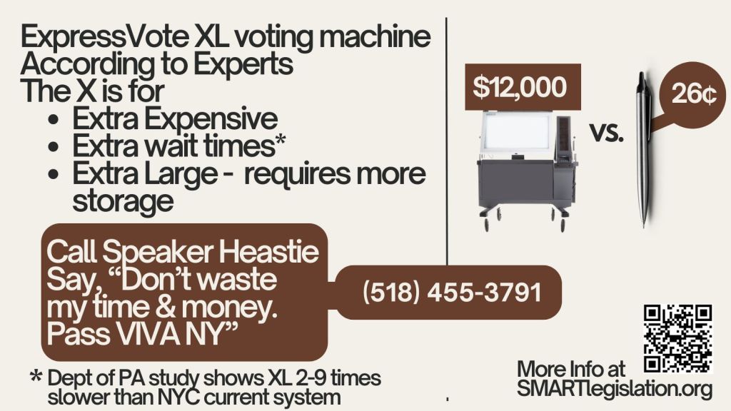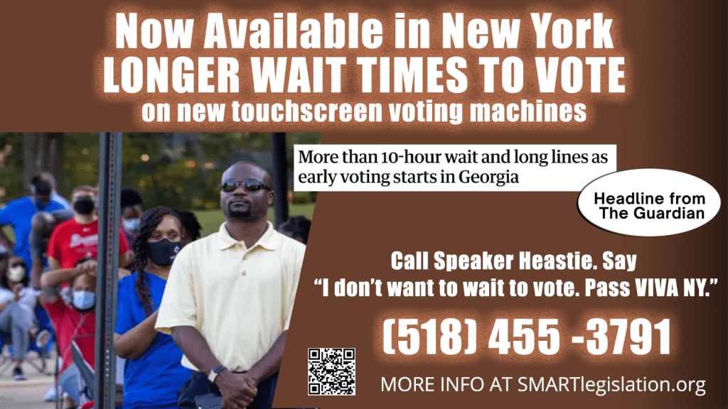 Please help us pass a bill called VIVA NY – The Voting Integrity and Verification Act of New York – A6287 (Brian Cunningham) / S7116 (Cordell Cleare). This is a simple bill that guarantees all New York voters a choice of either a hand-marked paper ballot, or an assistive device, whichever they prefer.